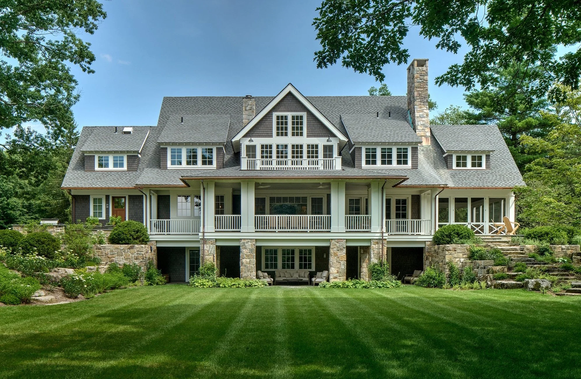 Originally built in 1917 by architect Alfredo Taylor, this Norfolk home has been carefully reimagined to preserve its architectural heritage while supporting a contemporary family lifestyle. The design begins with an open and fluid first floor, where kitchen, dining, and living spaces connect seamlessly—extending outward to a sweeping covered rear porch, a three-season screened porch, and views of the tennis court beyond. These moments of connection between interior and exterior create a natural rhythm for both everyday living and entertaining.